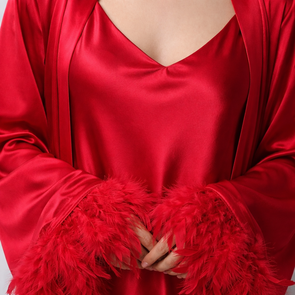 ست خواب پر فرشته شامل یک پیراهن ساتن خوشدوخت و یک روبدوشامبر ساتن با سرآستینهای پردار است که جلوهای لوکس و رمانتیک به استایل خواب شما میبخشد. پارچهی ساتن براق و لطیف آن روی پوست حس نرمی و سبکی ایجاد میکند و برای استفاده در منزل، شبهای خاص و عکسبرداری بسیار ایدهآل است.